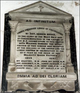 1. Prince Fredrick Lodge formed on January 28th 1796 and held meetings in the Ring o Bells public house by the Parish church in Halifax. 2. On 17th July 1809 the Lodge moved to Heptonstall and held its meetings at the Stag hotel in Heptonstall. On this momentous day, 57 craft Masons, 23 Royal Arch Masons and 33 Knights Templar formed a line of procession and, accompanied by the band, marched to the church of StThomas a Beckett, The day being one of consecration and rejoicing 3. Following the gale damage in 1847, rather than repair the church circa 1180 it was decide to build a new one on the other side of the churchyard. It took 7 years to build and the cost was locally borne. The Freemasons in the area being especially prominent. 4. On 15th May 1850 the Masonic Lodge Prince Frederick No. 307 of Hebden Bridge and Freemasons of Yorkshire West Riding together with Church Dignitaries, laid the North East corner stone of the New St. Thomas's Church. 5. In 1854, the top part of the West Wing Window was completed with Masonic glass. On the 23rd April 1898, the bottom four panels of the Window were completed, the designers being Myers of Munich, Germany. |